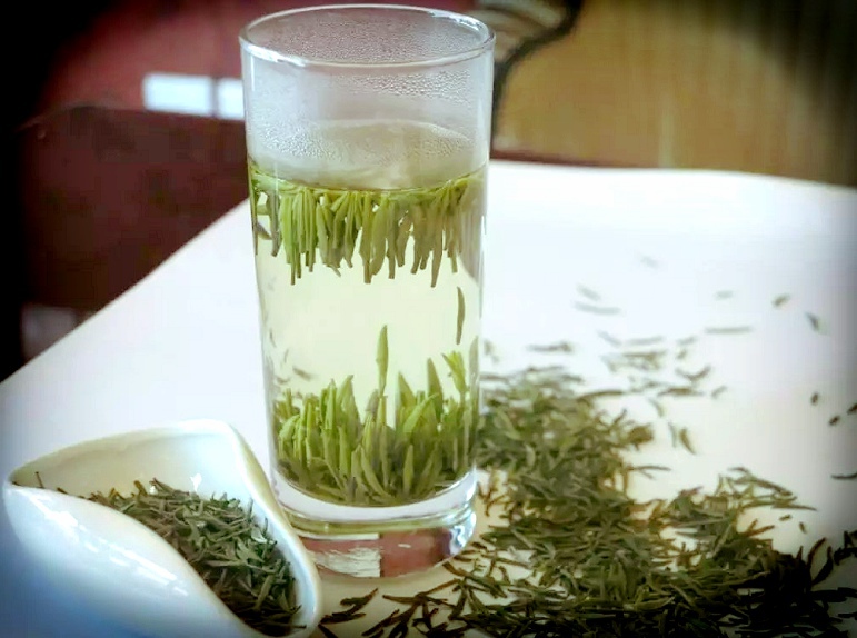 “凤源”仙毫,采自公司千亩有机茶园的细嫩单芽头。干茶微扁、较挺直,色泽翠绿显毫,